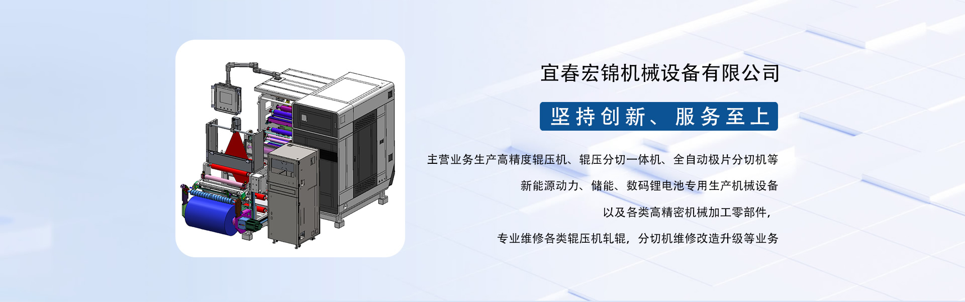 東莞市宏錦機(jī)械科技有限公司江西分公司是一家集研發(fā)、生產(chǎn)、銷(xiāo)售、服務(wù)于一體的創(chuàng)新型鋰電自動(dòng)化精密機(jī)械設(shè)備專(zhuān)業(yè)制造、服務(wù)商,坐落于江西省新余市渝水區(qū)新余經(jīng)濟(jì)開(kāi)發(fā)區(qū)孵化園5號(hào)廠(chǎng)房,廠(chǎng)房面積近6000平米,由東莞市宏錦機(jī)械科技有限公司于2024年11月投資新建,交通區(qū)位優(yōu)勢(shì)明顯、產(chǎn)業(yè)配套便捷集中,擁有一批具有行業(yè)豐富經(jīng)驗(yàn)的技術(shù)人員和管理團(tuán)隊(duì)。公司主營(yíng)業(yè)務(wù)生產(chǎn)高精度輥壓機(jī)、輥壓分切一體機(jī)、全自動(dòng)極片分切機(jī)等新能源動(dòng)力、儲(chǔ)能、數(shù)碼鋰電池專(zhuān)用生產(chǎn)機(jī)械設(shè)備以及各類(lèi)高精密機(jī)械加工零部件,專(zhuān)業(yè)維修各類(lèi)輥壓機(jī)軋輥,分切機(jī)維修改造升級(jí)等業(yè)務(wù)。根據(jù)公司發(fā)展三步走戰(zhàn)略規(guī)劃經(jīng)營(yíng)現(xiàn)下設(shè)三個(gè)二級(jí)獨(dú)立運(yùn)營(yíng)事業(yè)部分別為分切事業(yè)部(分切機(jī)、輥壓分切一體機(jī))、磨輥事業(yè)部(輥壓機(jī)、軋輥修磨)、機(jī)加事業(yè)部(精密機(jī)械部件加工)。經(jīng)過(guò)十余年沉淀發(fā)展主要客戶(hù)有新余贛鋒、南昌維科、宜春清陶、云南路華、河南恒一、江西程疆、四川天萊、蕪湖天弋、惠州億緯鋰能、無(wú)錫盤(pán)古新能源、鄭州比克、安徽鋰天下、臺(tái)灣長(zhǎng)利(宏基集團(tuán))、重慶維都利(紫建電子)、贛州諾威、安徽利維能、漳州萬(wàn)寶、重慶佳寶成、廣西皇冠儲(chǔ)能等一批具有行業(yè)知名度和影響力的企業(yè)。公司在新能源發(fā)展的道路上堅(jiān)持創(chuàng)新,為客戶(hù)帶來(lái)穩(wěn)定、高效的自動(dòng)化專(zhuān)用設(shè)備和更大的收益。